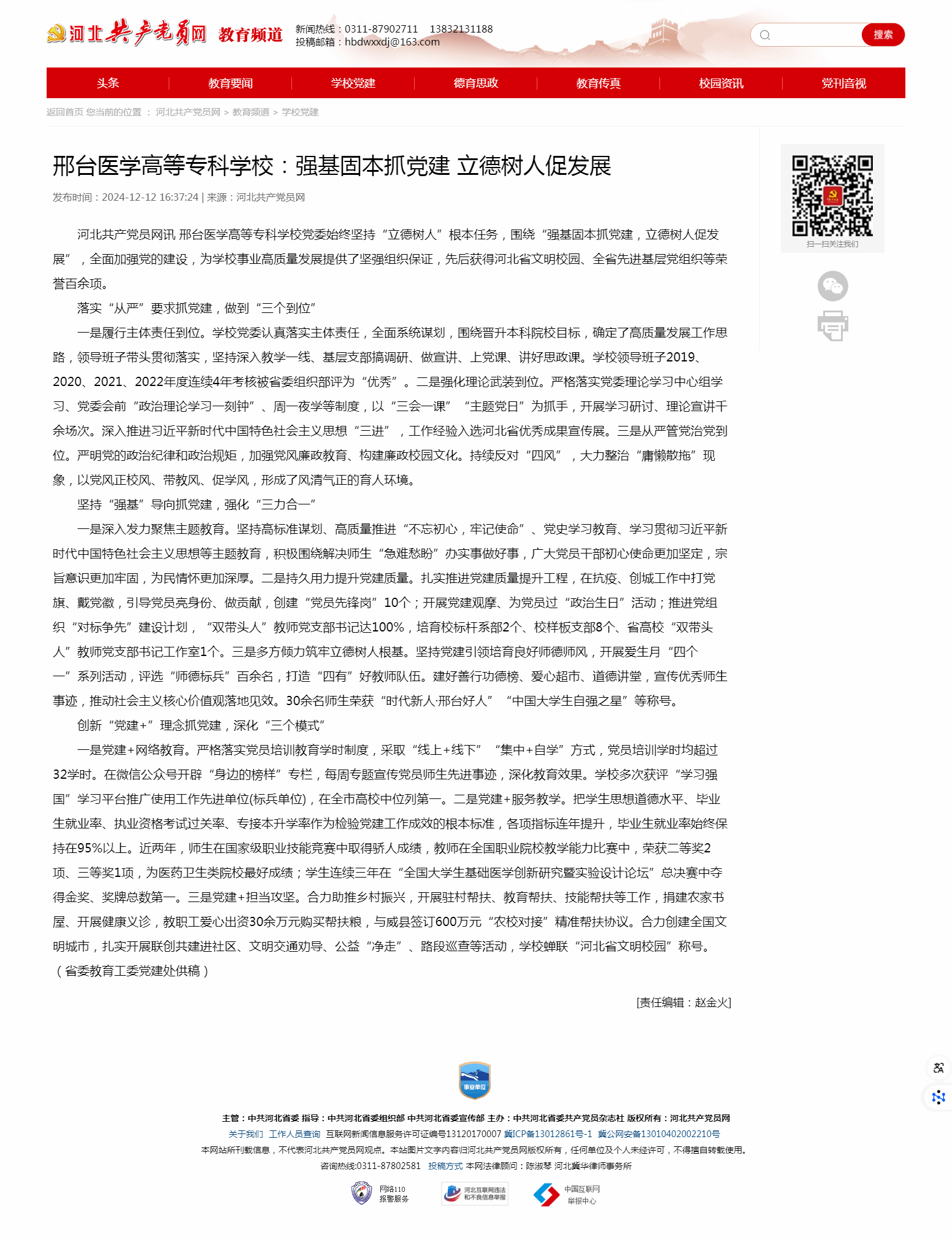 一是党建+网络教育。严格落实党员培训教育学时制度,采取“线上+线下”“集中+自学”方式,党员培训学时均超过32学时。在微信公众号开辟“身边的榜样”专栏,每周专题宣传党员师生先进事迹,深化教育效果。学校多次获评“学习强国”学习平台推广使用工作先进单位(标兵单位),在全市高校中位列第一。二是党建+服务教学。把学生思想道德水平、毕业生就业率、执业资格考试过关率、专接本升学率作为检验党建工作成效的根本标准,各项指标连年提升,毕业生就业率始终保持在95%以上。近两年,师生在国家级职业技能竞赛中取得骄人成绩,教师在全国职业院校教学能力比赛中,荣获二等奖2项、三等奖1项,为医药卫生类院校最好成绩;学生连续三年在“全国大学生基础医学创新研究暨实验设计论坛”总决赛中夺得金奖、奖牌总数第一。三是党建+担当攻坚。全力抗击新冠肺炎疫情,学校师生把投身防控疫情一线作为光荣使命,主动参与志愿服务活动,向社区、帮扶村捐赠抗疫物资,并捐款20多万元支持国家抗疫。学校组织2000余名党员在对口支援、隔离点建设中争当志愿者,紧急支援信都区、隆尧完成核酸采集50万人次。合力助推乡村振兴,开展驻村帮扶、教育扶贫、技能扶贫工作,捐建农家书屋、开展健康义诊,教职工爱心出资30余万元购买扶贫粮,与威县签订600万元“农校对接”精准扶贫协议。合力创建全国文明城市,扎实开展联创共建进社区、文明交通劝导、公益“净走”、路段巡查等活动,学校蝉联“河北省文明校园”称号。