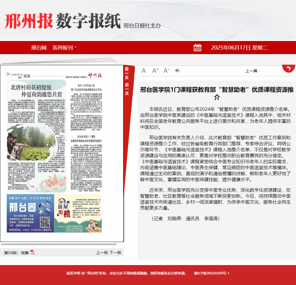 Beat365中文官方网站有关负责人介绍,此次教育部“智慧助老”优质工作案例和课程资源推介工作,经过各省级教育行政部门推荐、专家综合评议、网络公示等环节,《中医基础与适宜技术》课程入选推介名单,不仅是对学校教学资源建设与应用的高度认可,更是对学校推动职业教育惠民的充分肯定。《中医基础与适宜技术》课程紧密结合中医专业知识与老年人的实际需求,内容涵盖中医基础理论、中医养生保健、常见病症的中医适宜技术等模块。课程通过生动的案例、直观的演示和通俗易懂的讲解,帮助老年人更好地了解中医文化,掌握实用的中医保健技能,提升健康水平。