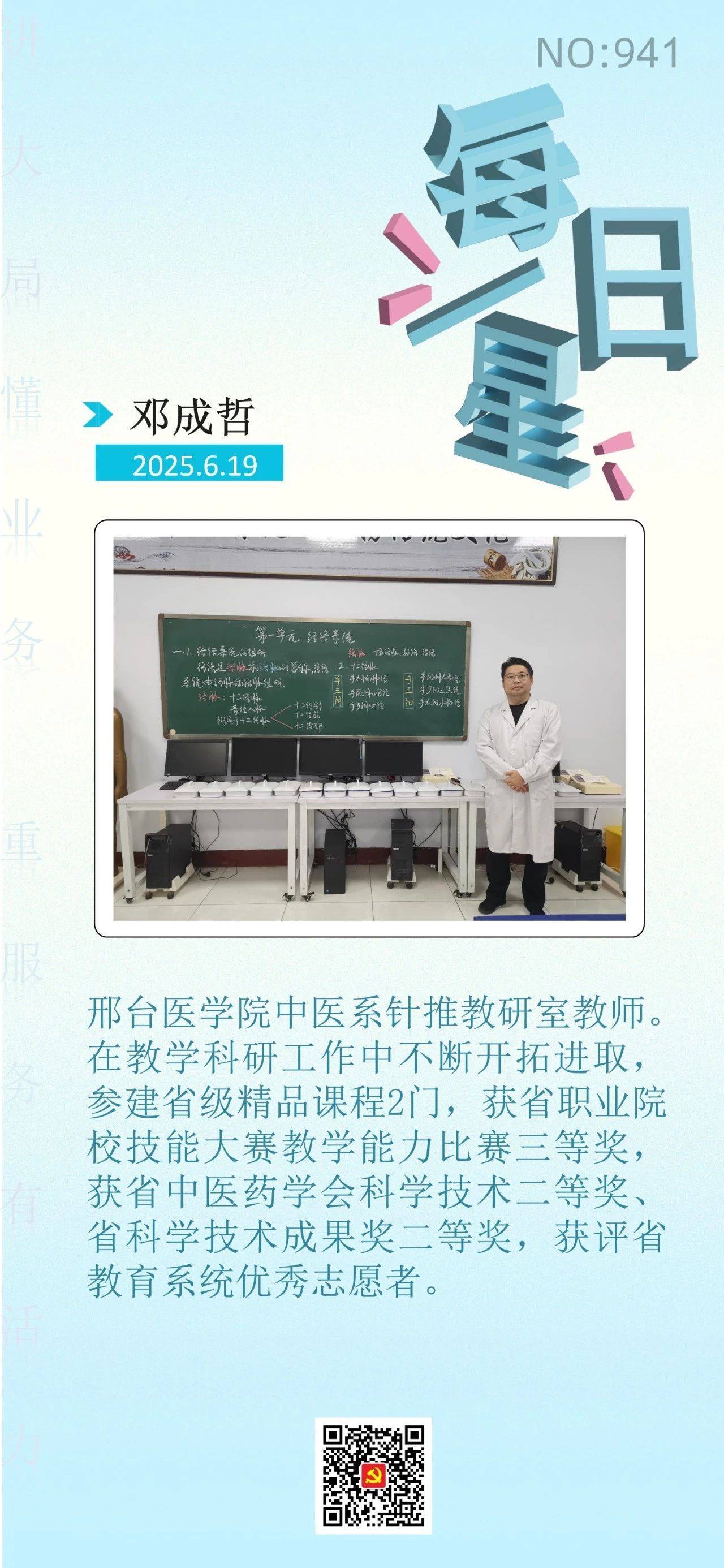 学校紧扣“讲大局、懂业务、重服务、有活力”总要求,坚持党建领航,聚焦重点任务,持续提高工作效率,转变工作作风,加强党员干部和教师队伍建设,涌现出一批叫得响、立得住、过得硬、师生认可的先进典型。经组织宣传统战部推荐,中医系针推教研室教师邓成哲被市直工委评为6月19日“每日一星”,事迹在“机关党建订阅号”【每日一星·四型干部】栏目报道。