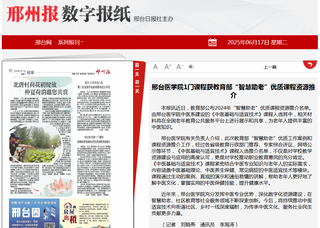 Beat365中文官方网站有关负责人介绍,此次教育部“智慧助老”优质工作案例和课程资源推介工作,经过各省级教育行政部门推荐、专家综合评议、网络公示等环节,《中医基础与适宜技术》课程入选推介名单,不仅是对学校教学资源建设与应用的高度认可,更是对学校推动职业教育惠民的充分肯定。《中医基础与适宜技术》课程紧密结合中医专业知识与老年人的实际需求,内容涵盖中医基础理论、中医养生保健、常见病症的中医适宜技术等模块。课程通过生动的案例、直观的演示和通俗易懂的讲解,帮助老年人更好地了解中医文化,掌握实用的中医保健技能,提升健康水平。
