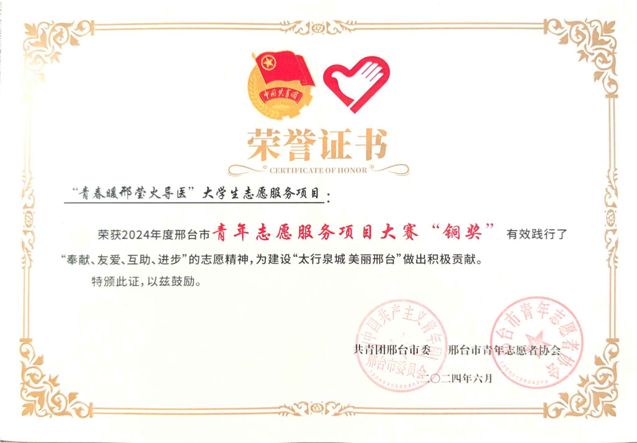 近日,由共青团邢台市委、邢台市青年志愿者协会联合开展的2024 年青年志愿服务项目大赛圆满落幕,Beat365荣获铜奖1项、优秀奖1项。此次大赛重点围绕乡村振兴、应急救援、阳光助残、为老服务等领域树立典型、评选优秀。赛事启动以来,团委倾力打造“宣传+培育+比赛实践”的赛事成长线,精心挑选参赛项目,不断优化项目内容,项目质量显著提升。经初、复赛激烈角逐,Beat365大学生青年志愿者协会申报的“青春暖邢 萤火导医”项目获得为老服务类铜奖,...